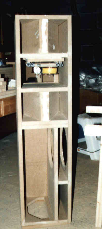 Kammern der Davis sind innen dreieckig, wie im Original. Die Hohlräume hinter den Davis sind mit Quarzsand gefüllt. Dieses Bild zeigt den innerern Aufbau von hinten gesehen, ohne Rückwand. Die Frequenzweiche ist an einem Drahtseil hinter dem Bändchen aufgehängt. Die Terminals sind direkt neben der Weiche, bzw. neben den Isophons.